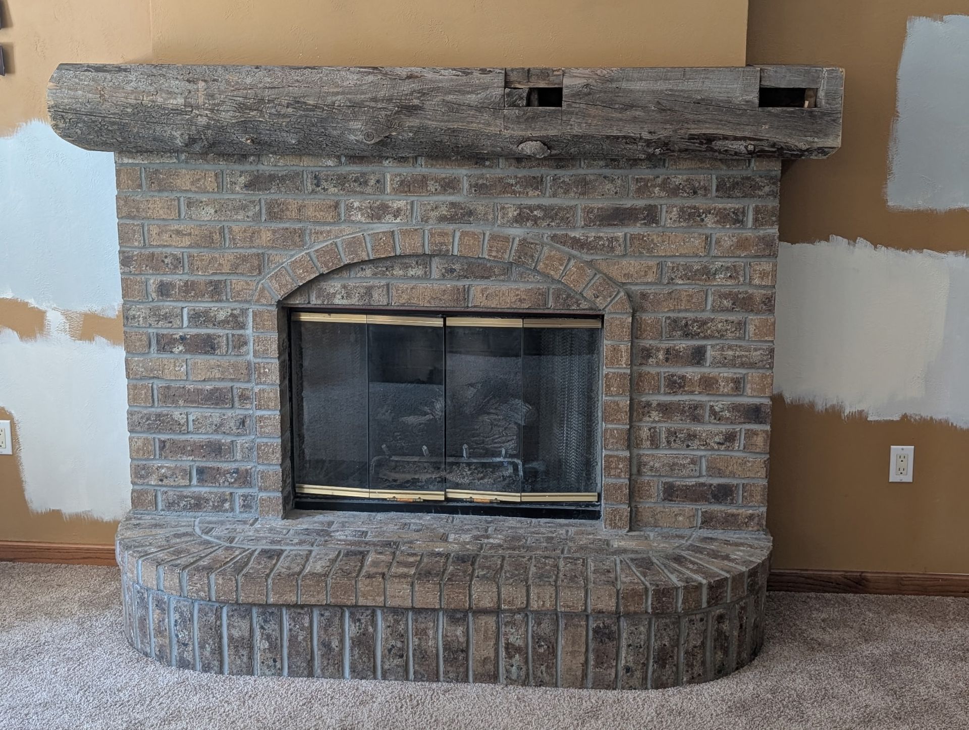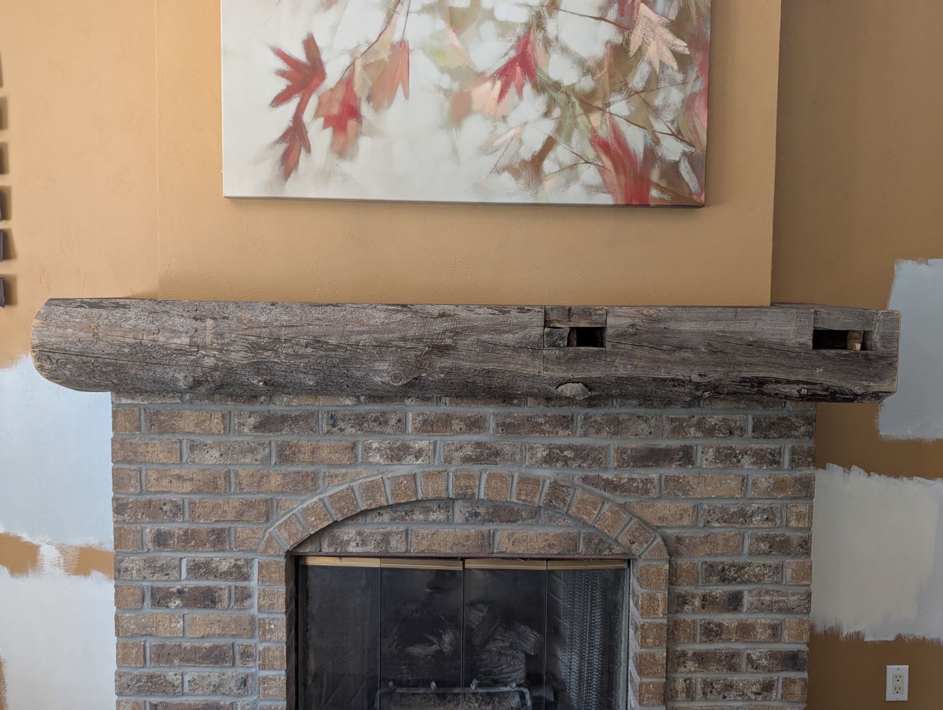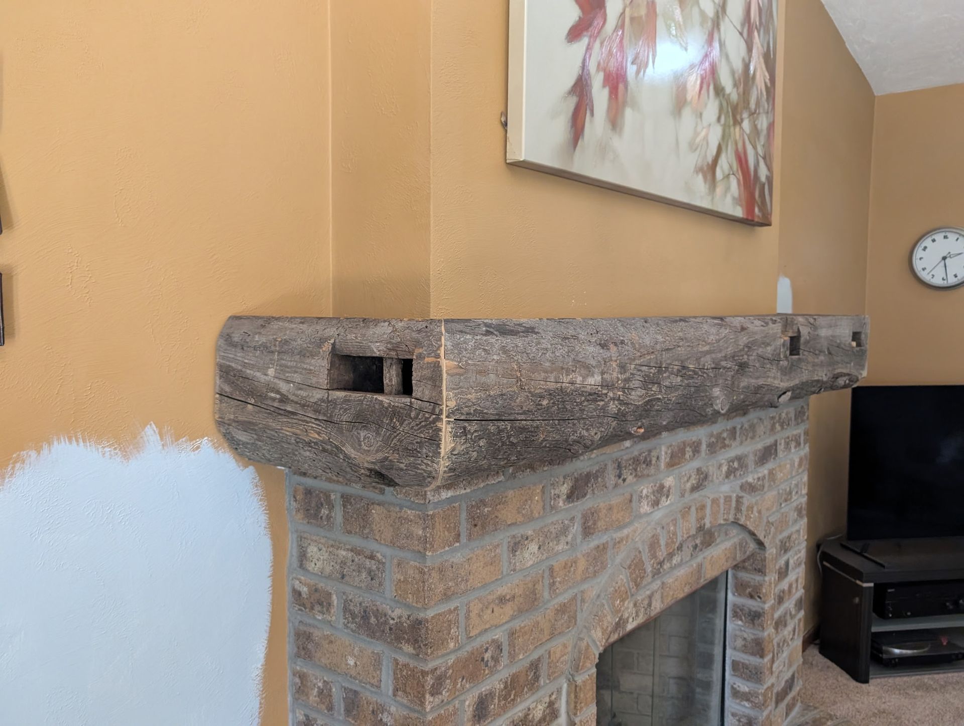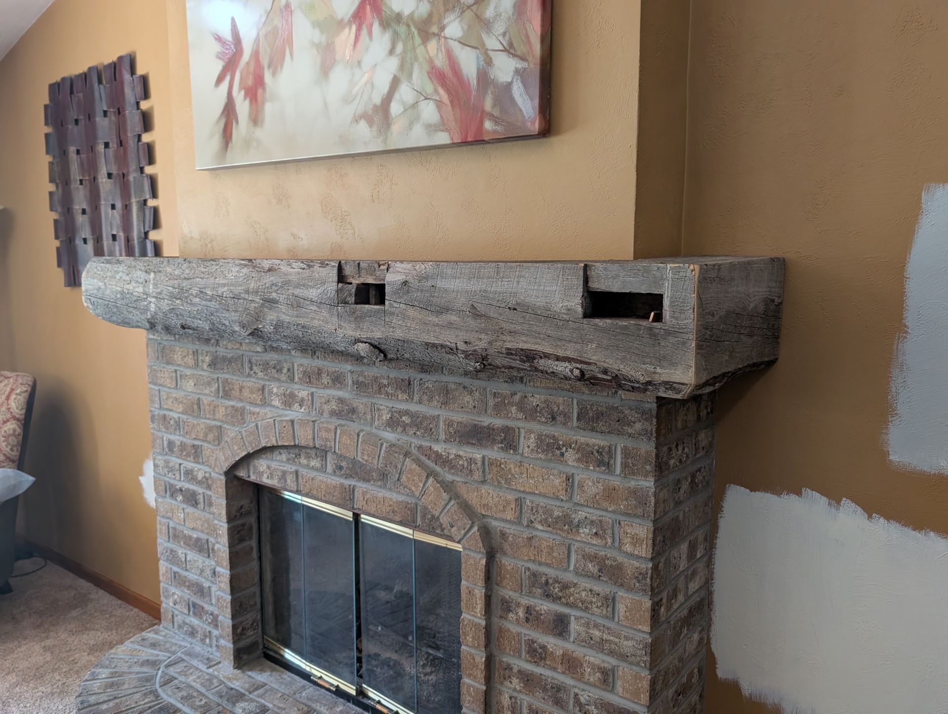 In this project we took the fake golden oak beam (seen in the first picture) from this mantle and transformed it with a reclaimed 400 Year old Red Pine Barn Beam recovered from a dissembled structure. We create works of art with nature's beauty.